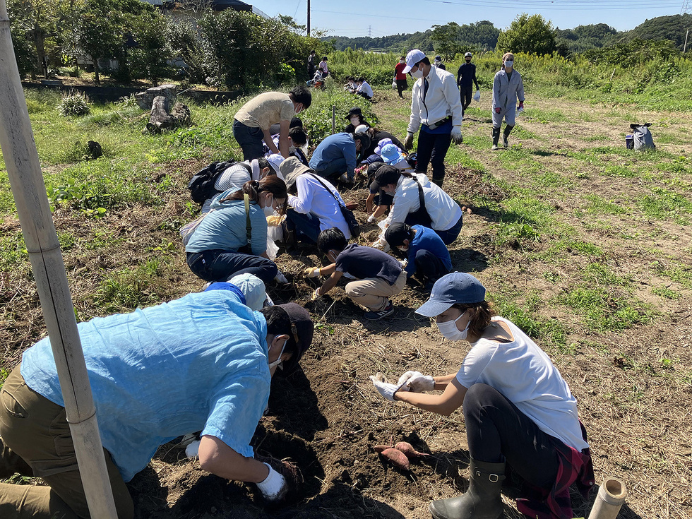 この日は、自然や農業に親しんでもらうための体験会となりました。稲刈りから稲束づくり、おだ架けまで一連の作業を体験しました。さつま芋やかぼちゃの収穫も体験し、よいお土産になったのではないでしょうか。