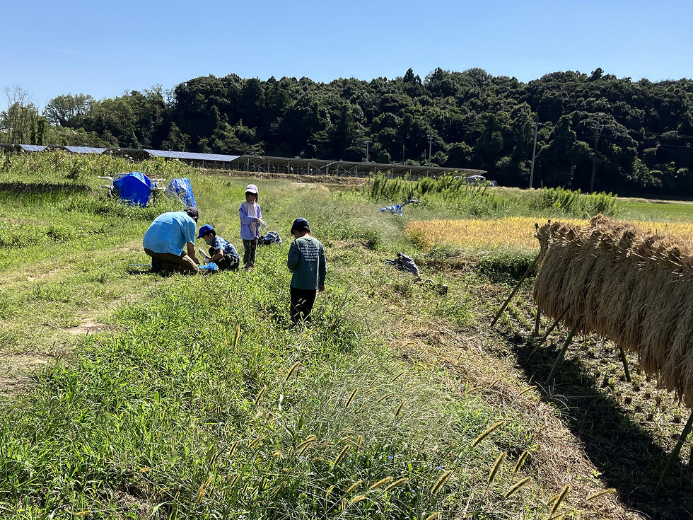 農薬を一切使わないため、カエルやバッタなど小さな生き物もいっぱい!虫捕りに熱中する子どももいて、籠いっぱいに捕まえていました(後で逃してやりました)。